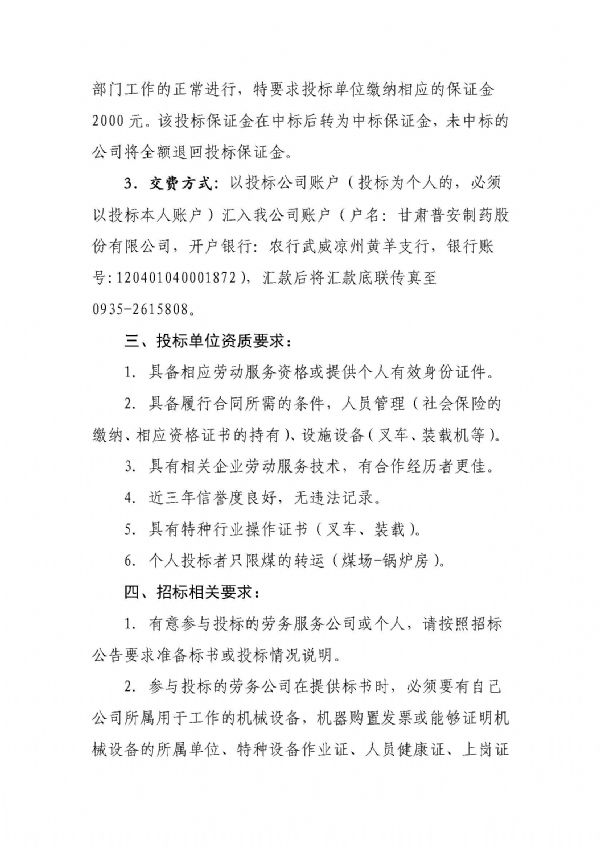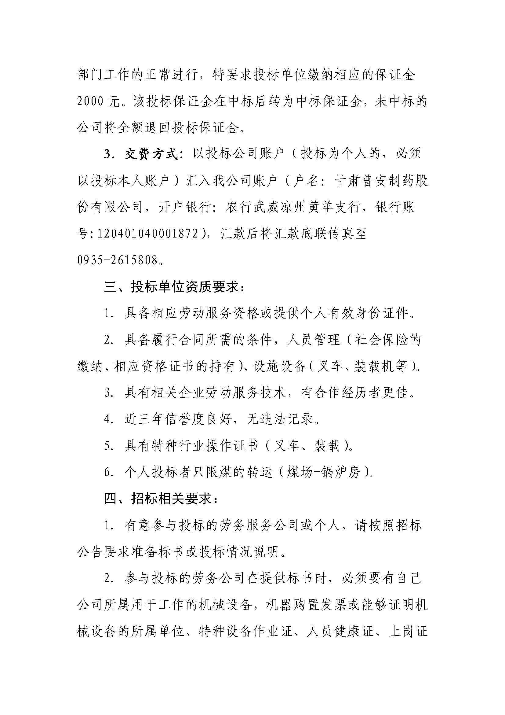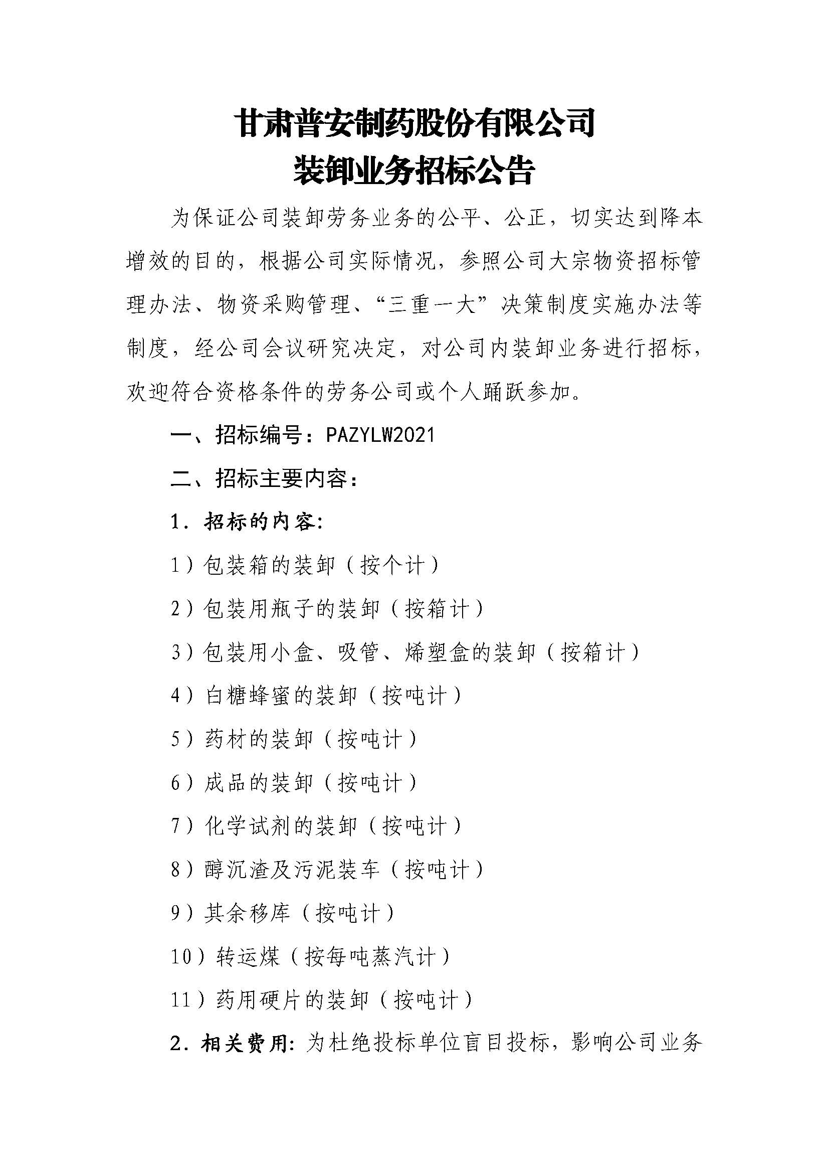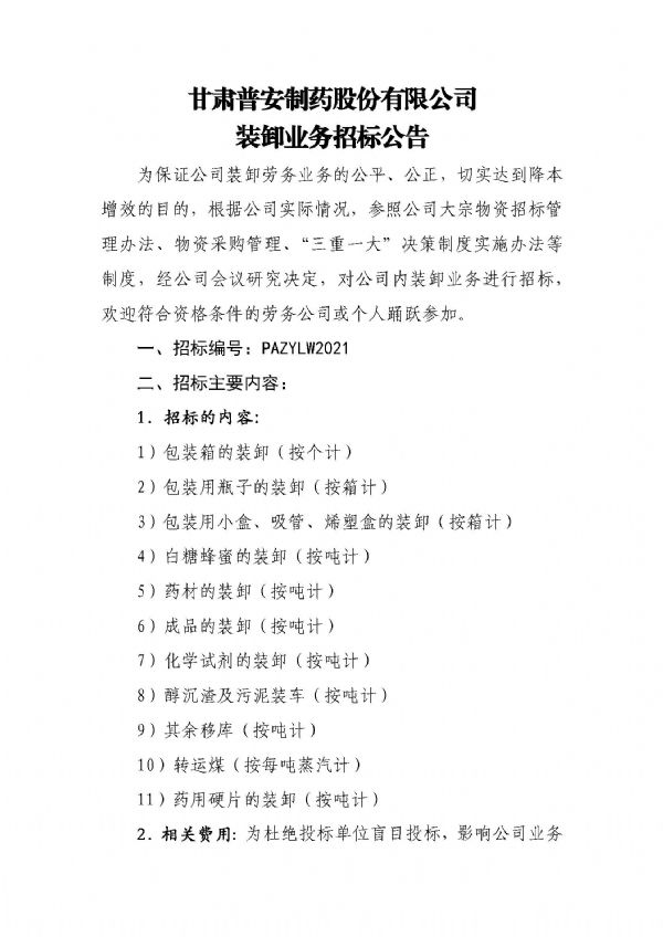 甘肅普安制藥股份有限公司裝卸業(yè)務(wù)招標(biāo)公告
