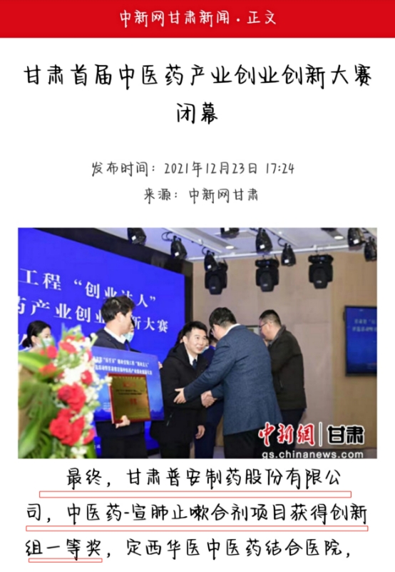 多家媒體爭(zhēng)相報(bào)道,“甘肅普安制藥股份有限公司榮獲甘肅省首屆中醫(yī)藥產(chǎn)業(yè)創(chuàng)業(yè)創(chuàng)新大賽創(chuàng)新組第一”強(qiáng)勢(shì)霸屏
