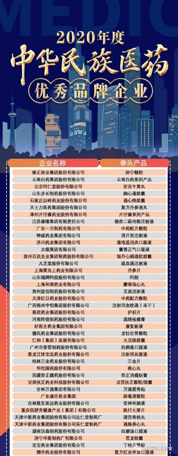 全國工商聯(lián)醫(yī)藥業(yè)商會(huì)通過企業(yè)申報(bào)、地方工商聯(lián)推薦、各專業(yè)分會(huì)信息匯總以及網(wǎng)絡(luò)數(shù)據(jù)分析等途徑,經(jīng)過秘書處統(tǒng)計(jì)整理,綜合市場銷售額、行業(yè)占比、品牌認(rèn)知、科技創(chuàng)新、國際化程度以及企業(yè)專精特新的特點(diǎn)等因素,報(bào)評(píng)審委員會(huì)評(píng)選出“2020 年度中華民族醫(yī)藥優(yōu)秀品牌企業(yè)”。本次評(píng)選,旨在弘揚(yáng)民族醫(yī)藥、打造民族品牌,樹立行業(yè)標(biāo)桿、發(fā)揮榜樣作用、促進(jìn)民族醫(yī)藥產(chǎn)業(yè)健康發(fā)展。