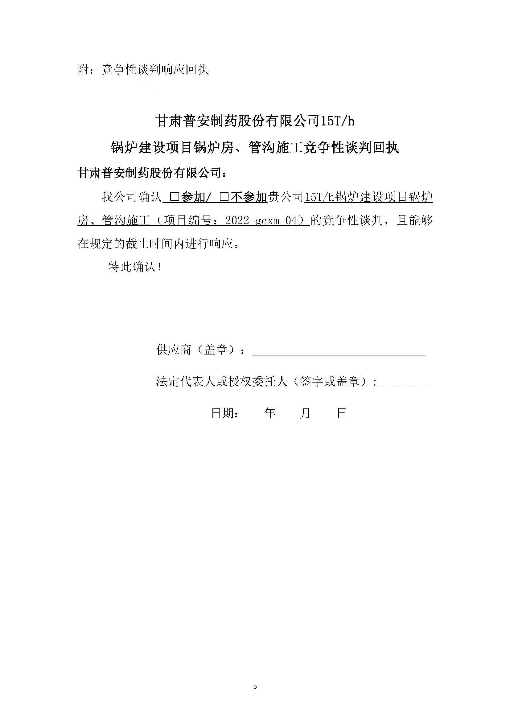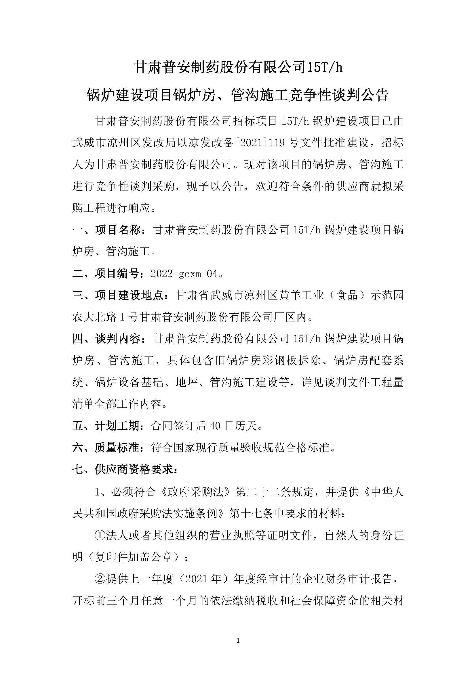 甘肅普安制藥股份有限公司15T/h鍋爐建設項目鍋爐房、管溝施工競爭性談判公告