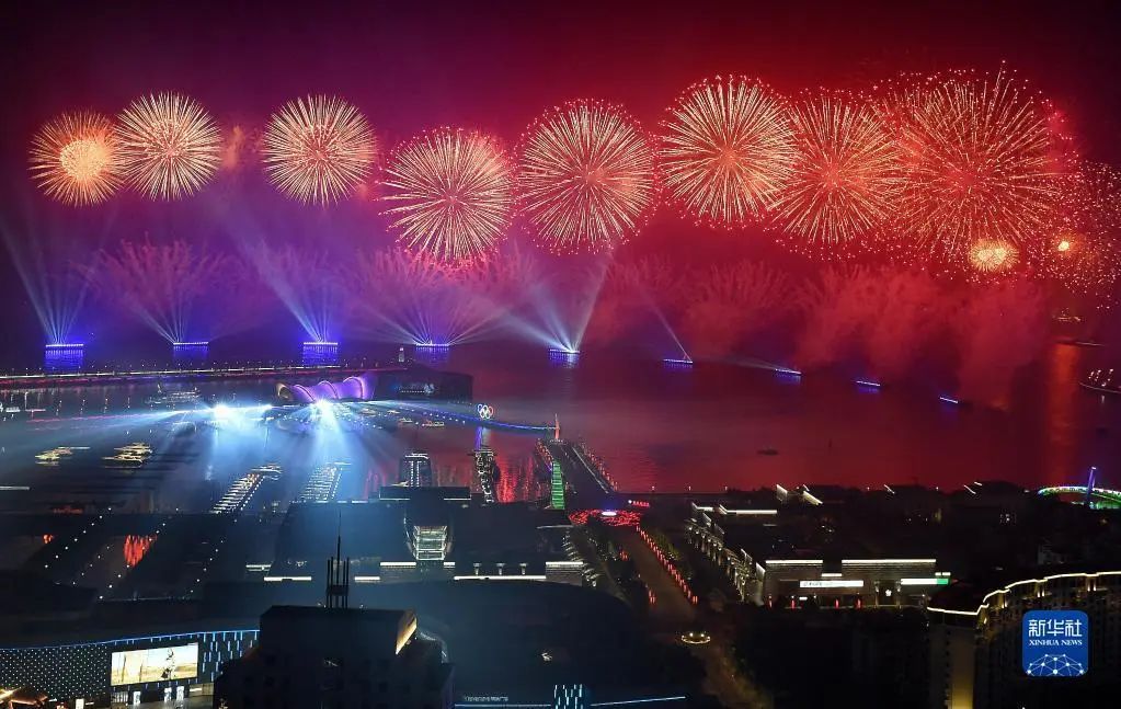這是上合組織青島峰會期間舉行的《有朋自遠方來》燈光焰火藝術表演(2018年6月9日攝)。新華社記者 李紫恒 攝