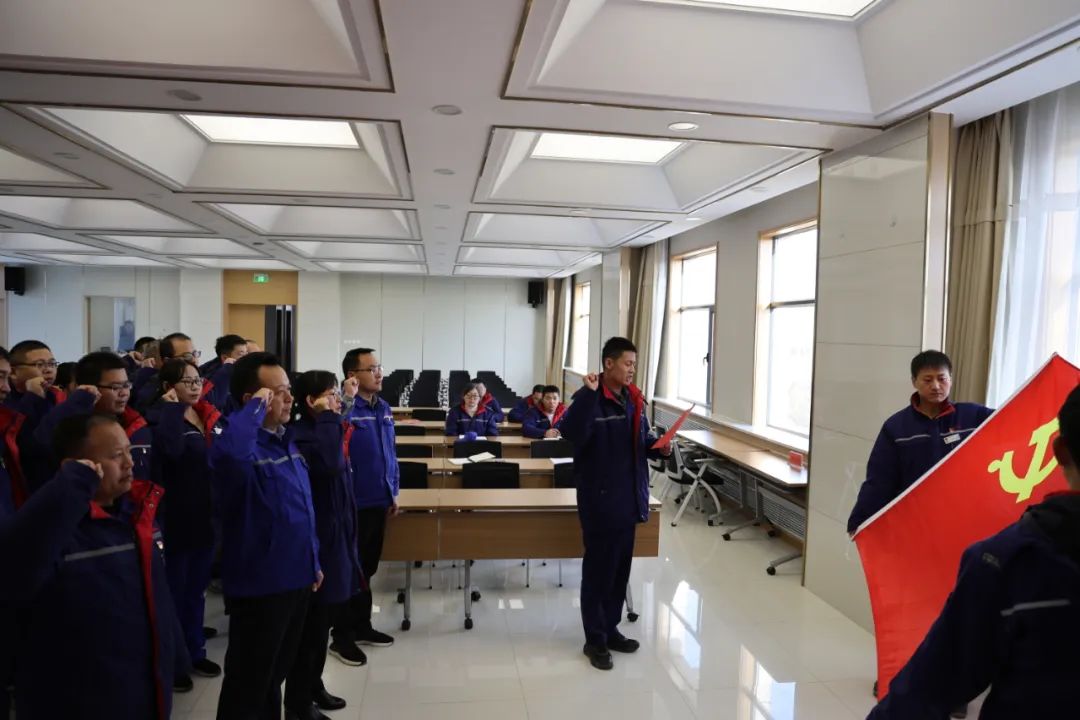 大會(huì)在莊嚴(yán)的國歌聲中拉開帷幕,全體黨員面向鮮紅的黨旗,重溫入黨誓詞并莊嚴(yán)宣誓。