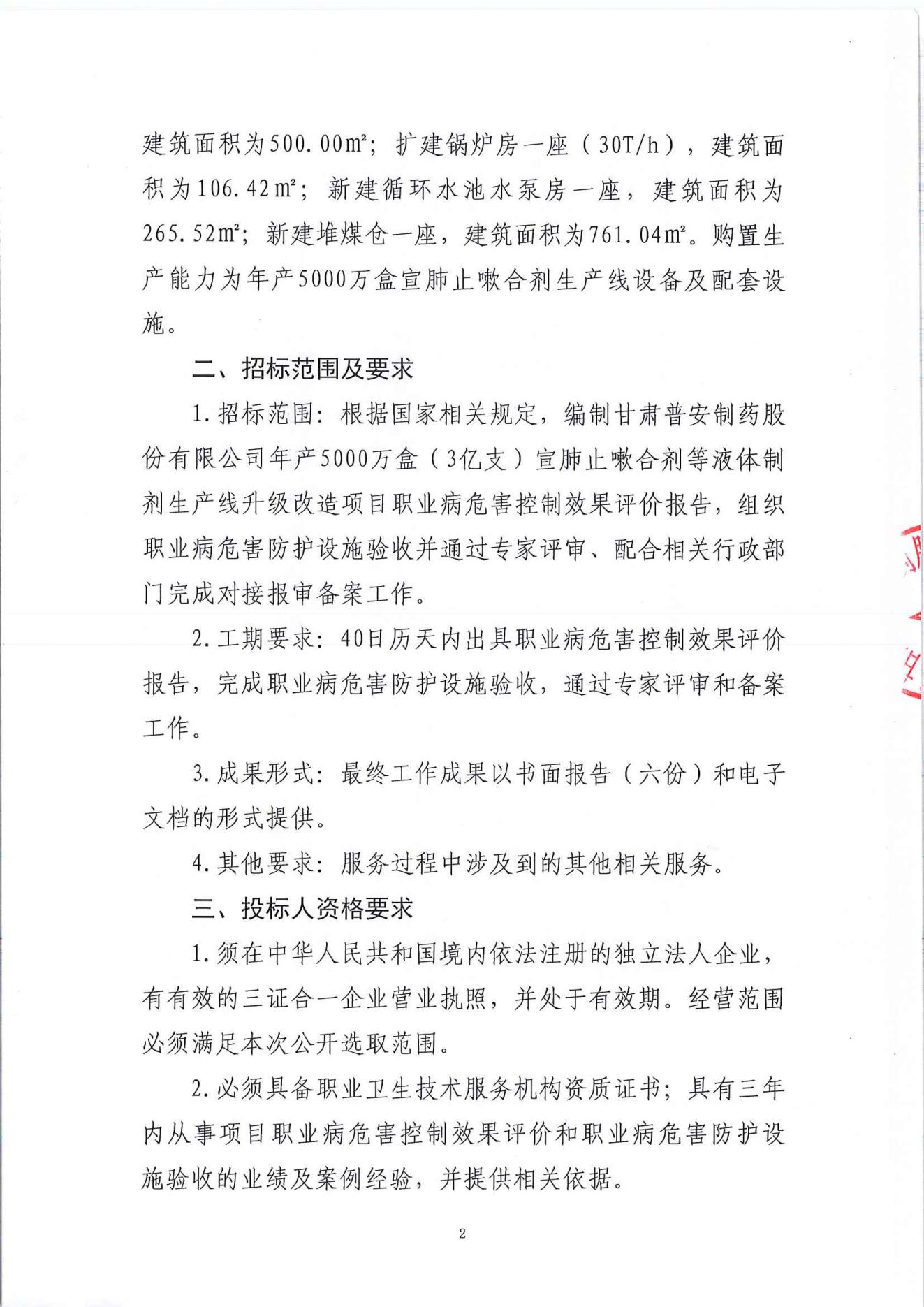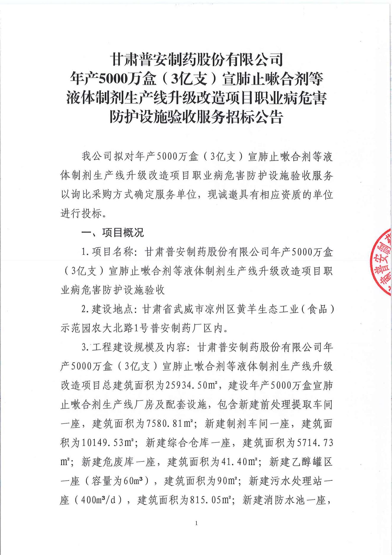 甘肅普安制藥股份有限公司年產(chǎn)5000萬盒(3億支)宣肺止嗽合劑等液體制劑生產(chǎn)線升級改造項(xiàng)目職業(yè)病危害防護(hù)設(shè)施驗(yàn)收服務(wù)招標(biāo)公告