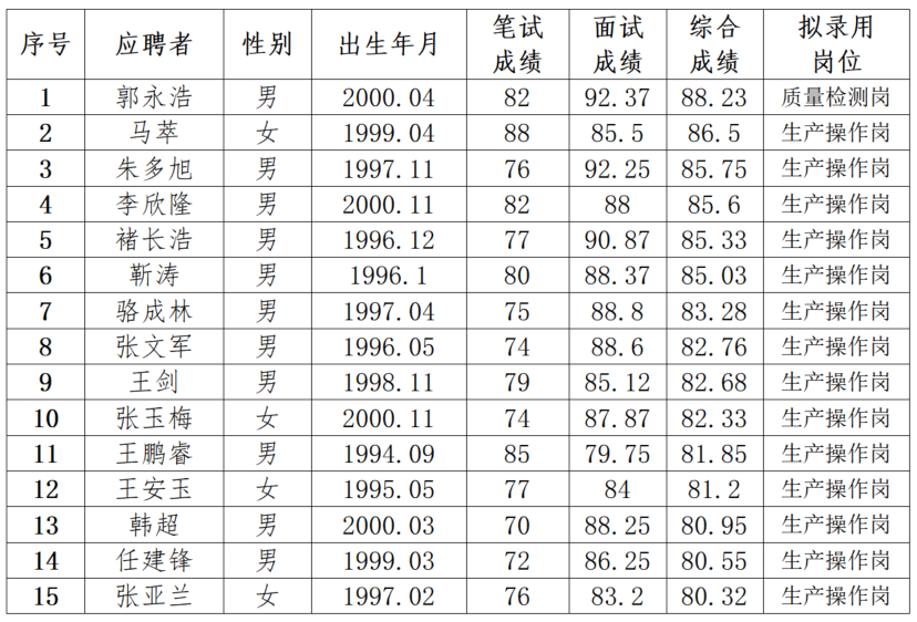 根據《甘肅藥業集團市場化招聘工作流程》,通過發布公告、資格審查、組織筆試、面試、體檢等環節,現將擬招錄的15位人員名單公示如下: