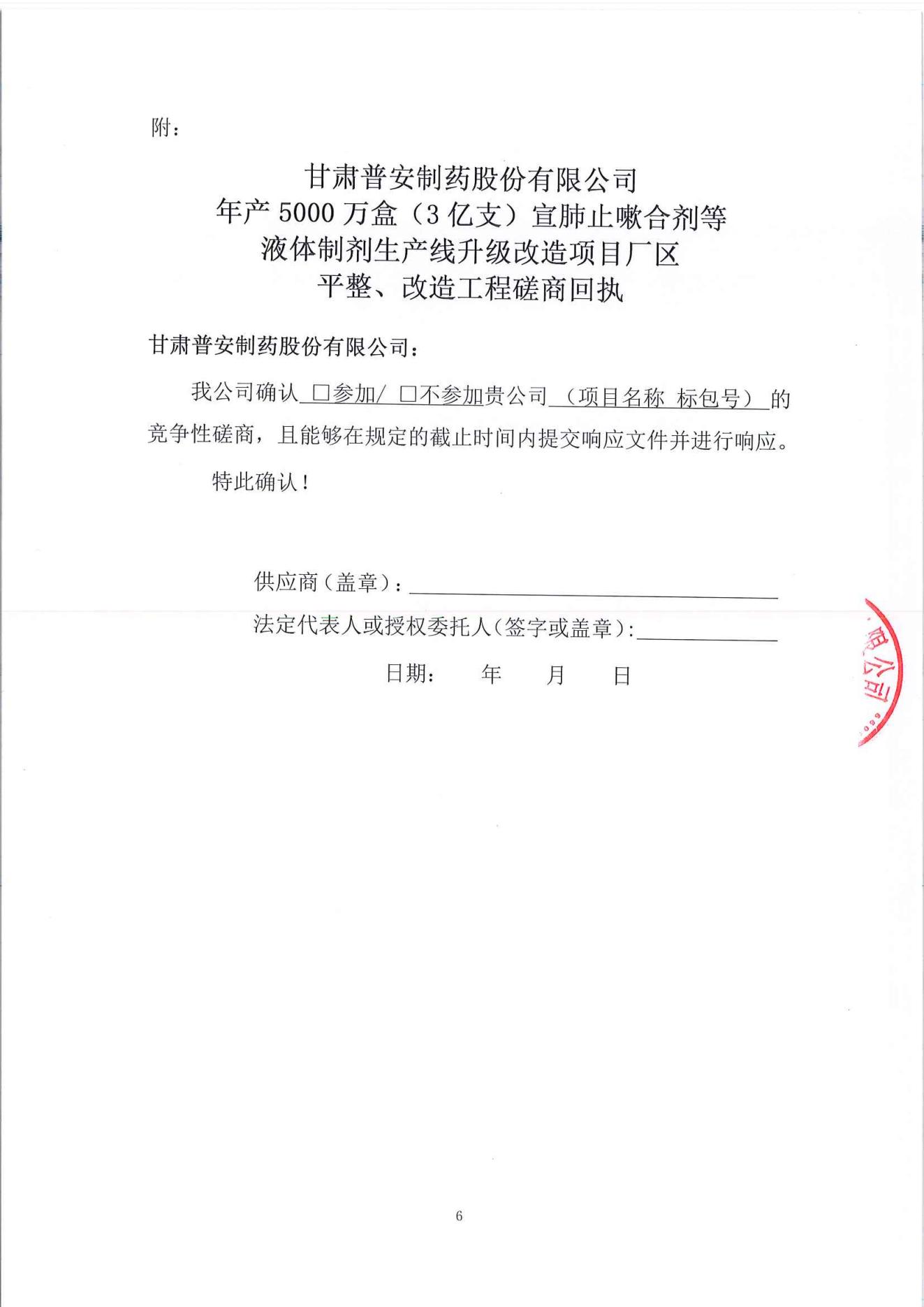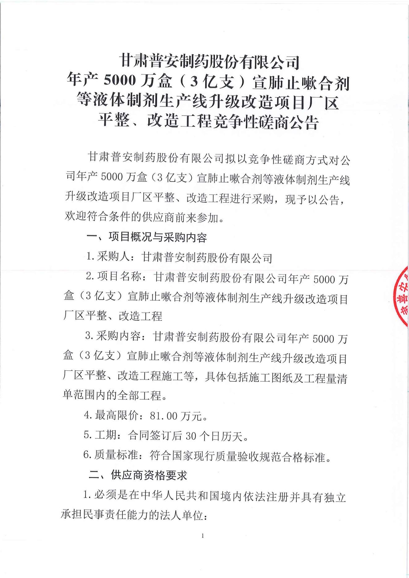 甘肅普安制藥股份有限公司年產(chǎn)5000萬盒(3億支)宣肺止嗽合劑等液體制劑生產(chǎn)線升級(jí)改造項(xiàng)目廠區(qū)平整、改造工程競(jìng)爭(zhēng)性磋商公告