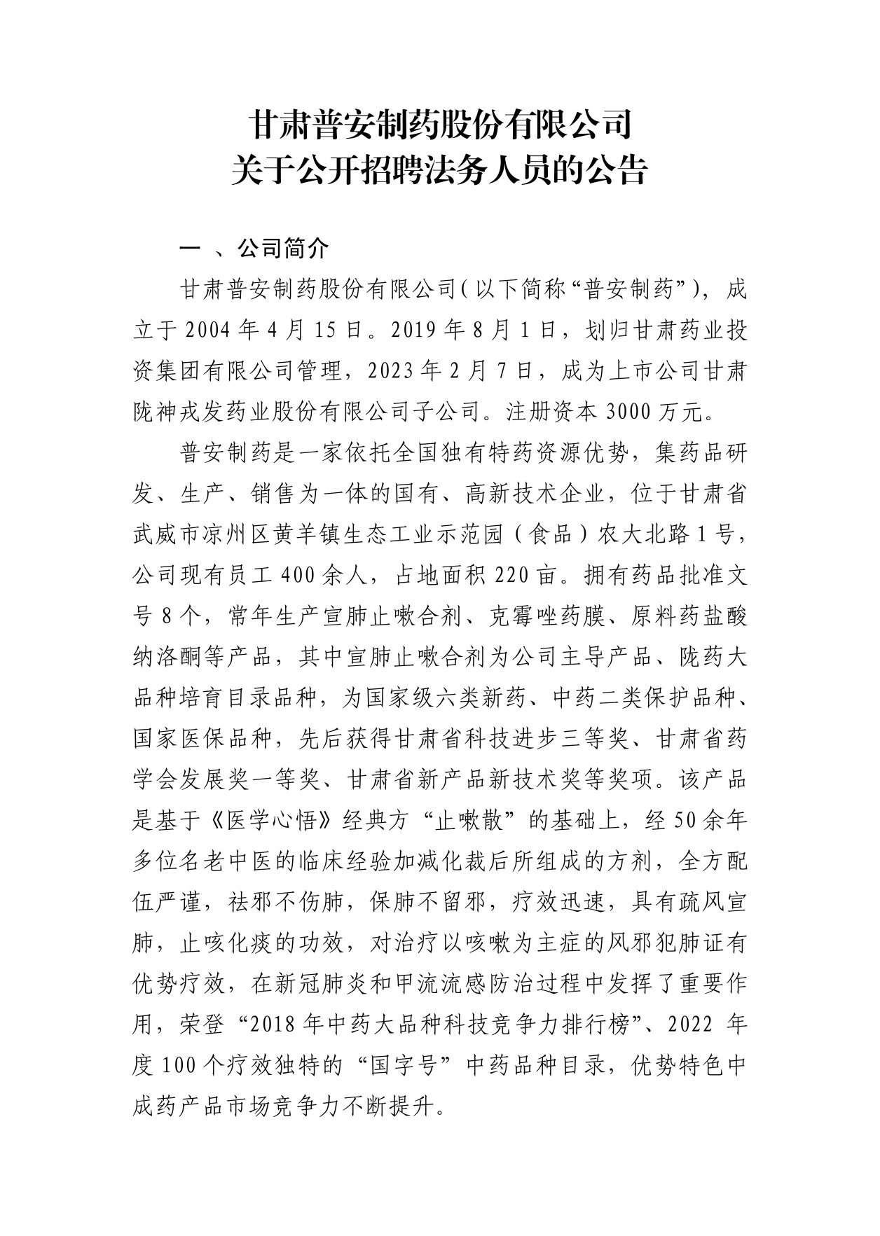 甘肅普安制藥股份有限公司 關于公開招聘法務人員的公告