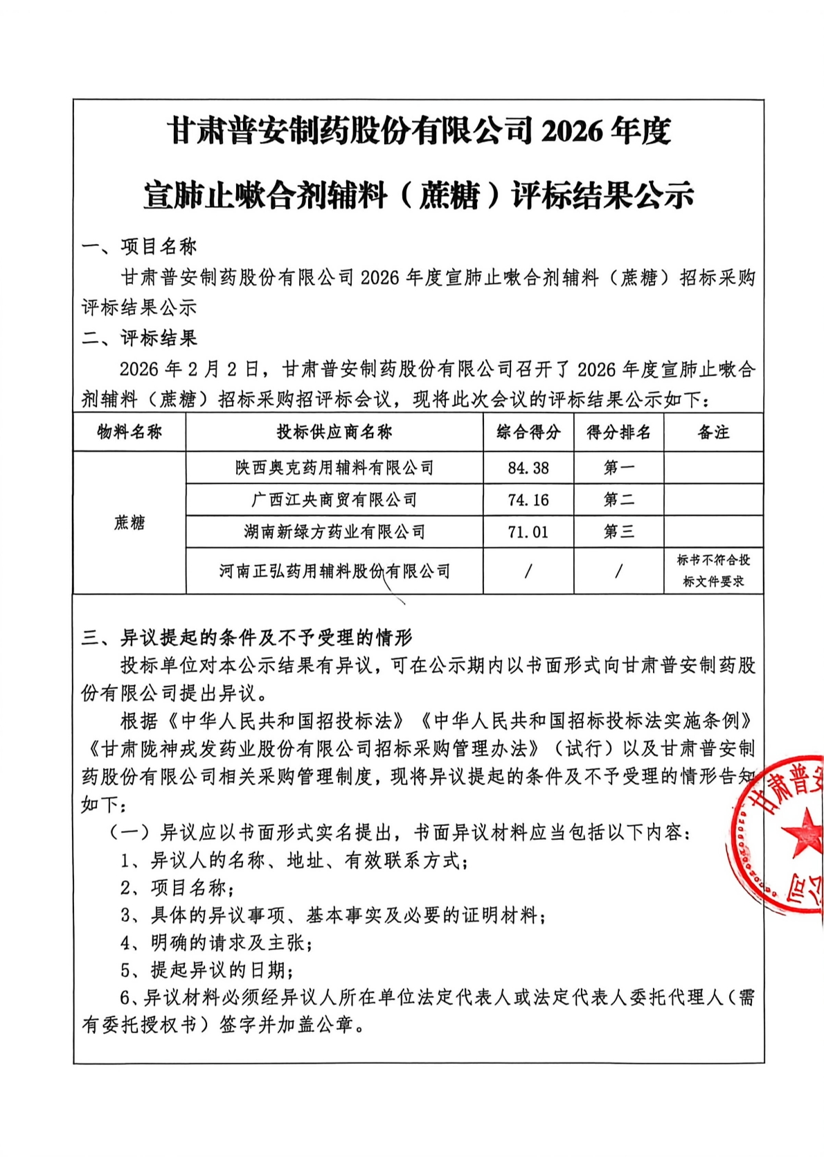 甘肅普安制藥股份有限公司2026年度 宣肺止嗽合劑輔料(蔗糖)評(píng)標(biāo)結(jié)果公示