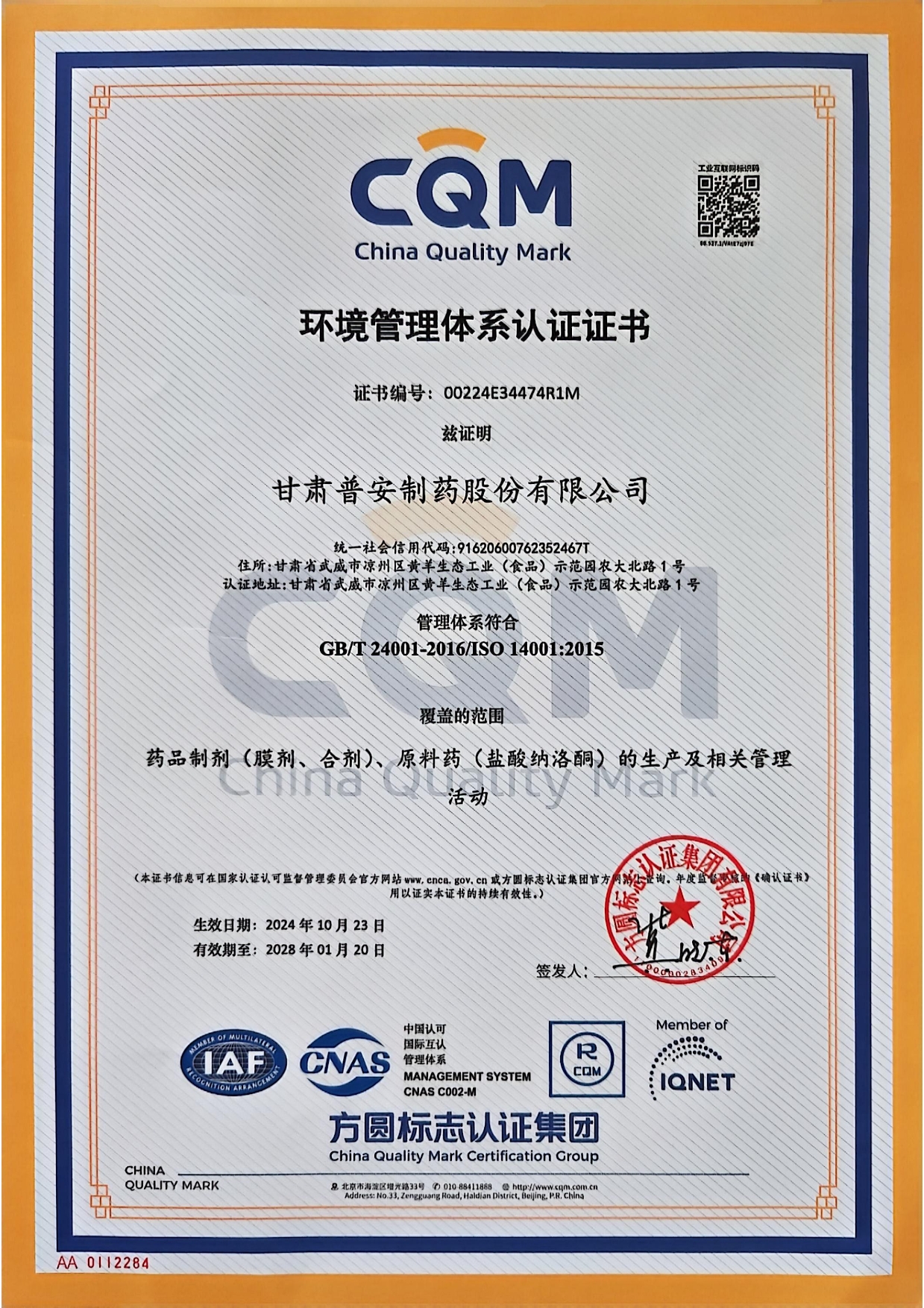 環(huán)境管理體系認(rèn)證證書