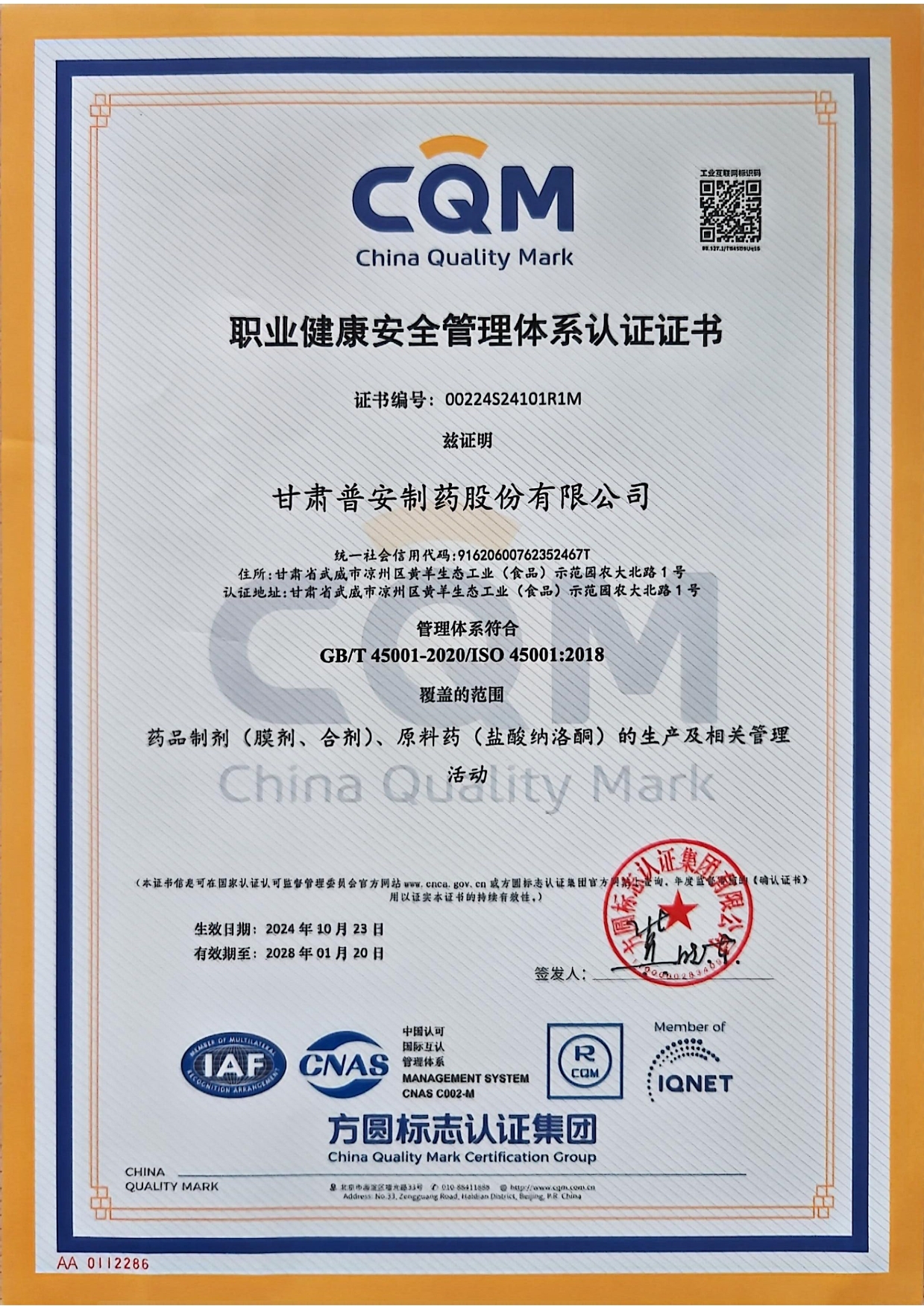 職業(yè)健康安全管理體系認(rèn)證證書
