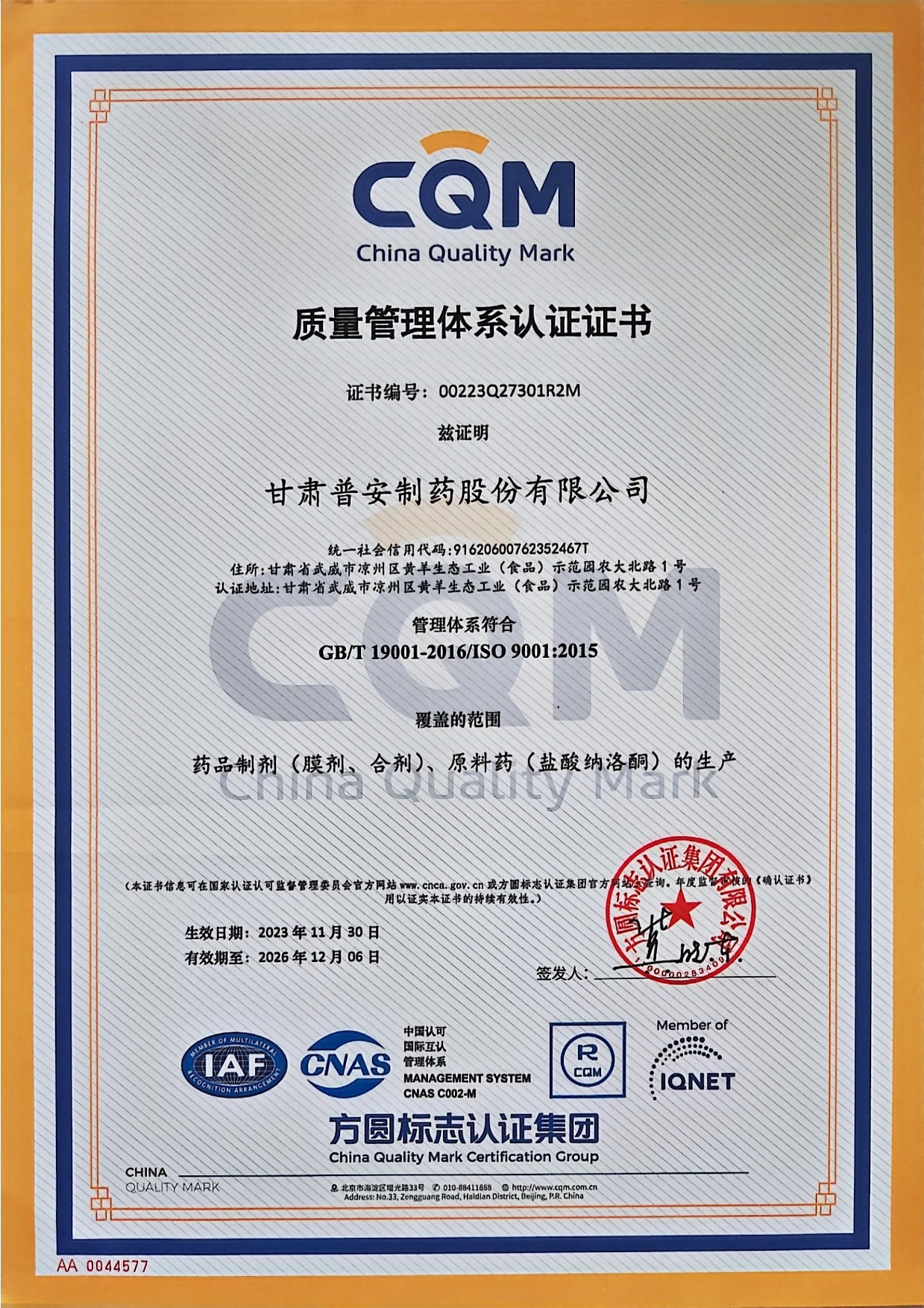 質(zhì)量管理體系認(rèn)證證書